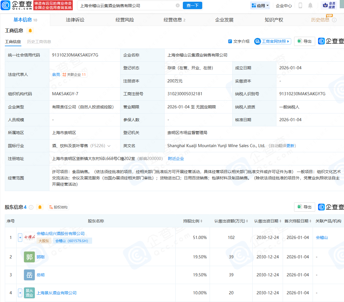 近日,上海会稽山云集酒业销售有限公司配置,法定代表东谈主为翁亮,经营范围包含:食物销售;组织文化艺术相易动作;会议及展览职业;日用百货销售;包装材料及成品销售等。企查查股权穿透显露,该公司由会稽山(601579)、郭刚等共同捏股。